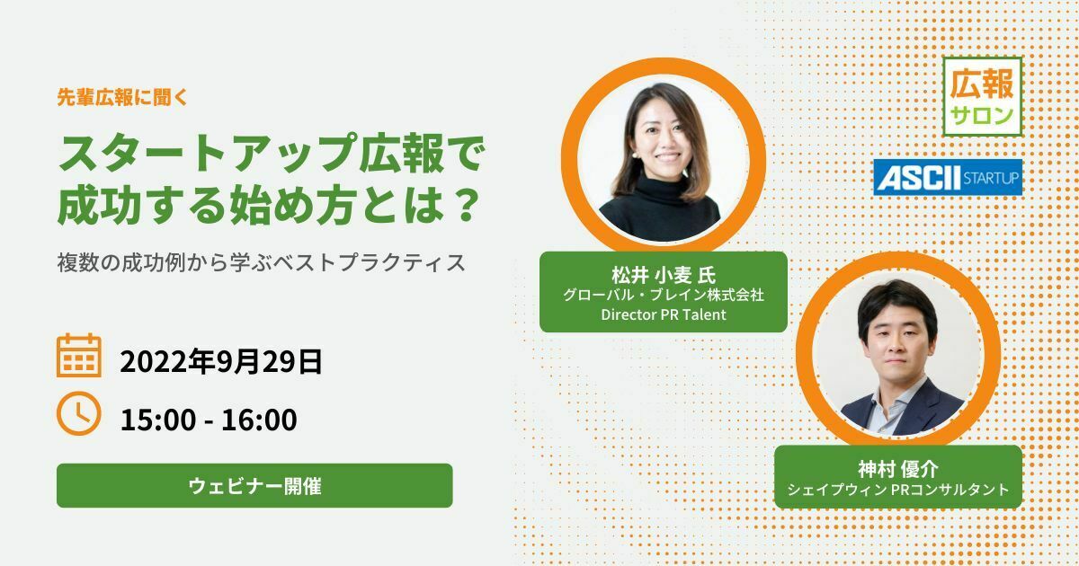 スタートアップから中堅・大手企業まで様々な業種の広報担当者のためのオンラインサロンです。専門家・先輩広報・メディアにSlack上で気軽に相談できるプラットフォームの提供をはじめ、広報担当者同士の交流、スキルアップに繋がるセミナーコンテンツの提供をしています。主宰:シェイプウィン株式会社、運営協力パートナー:ASCII STARTUP